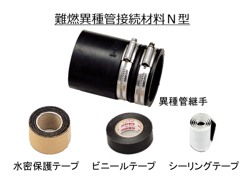 難燃 TAC レックスと異種管との接続に用いる接続材料です。異種管側はバンド締め、難燃TAC レックス側はテープ巻きとなります。