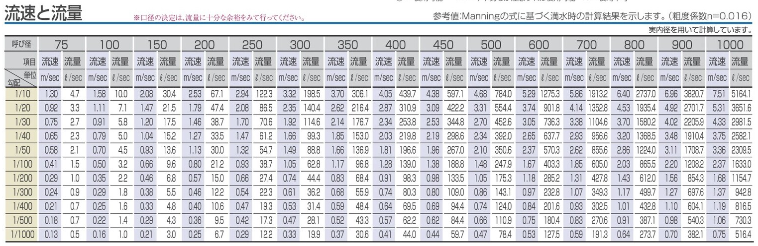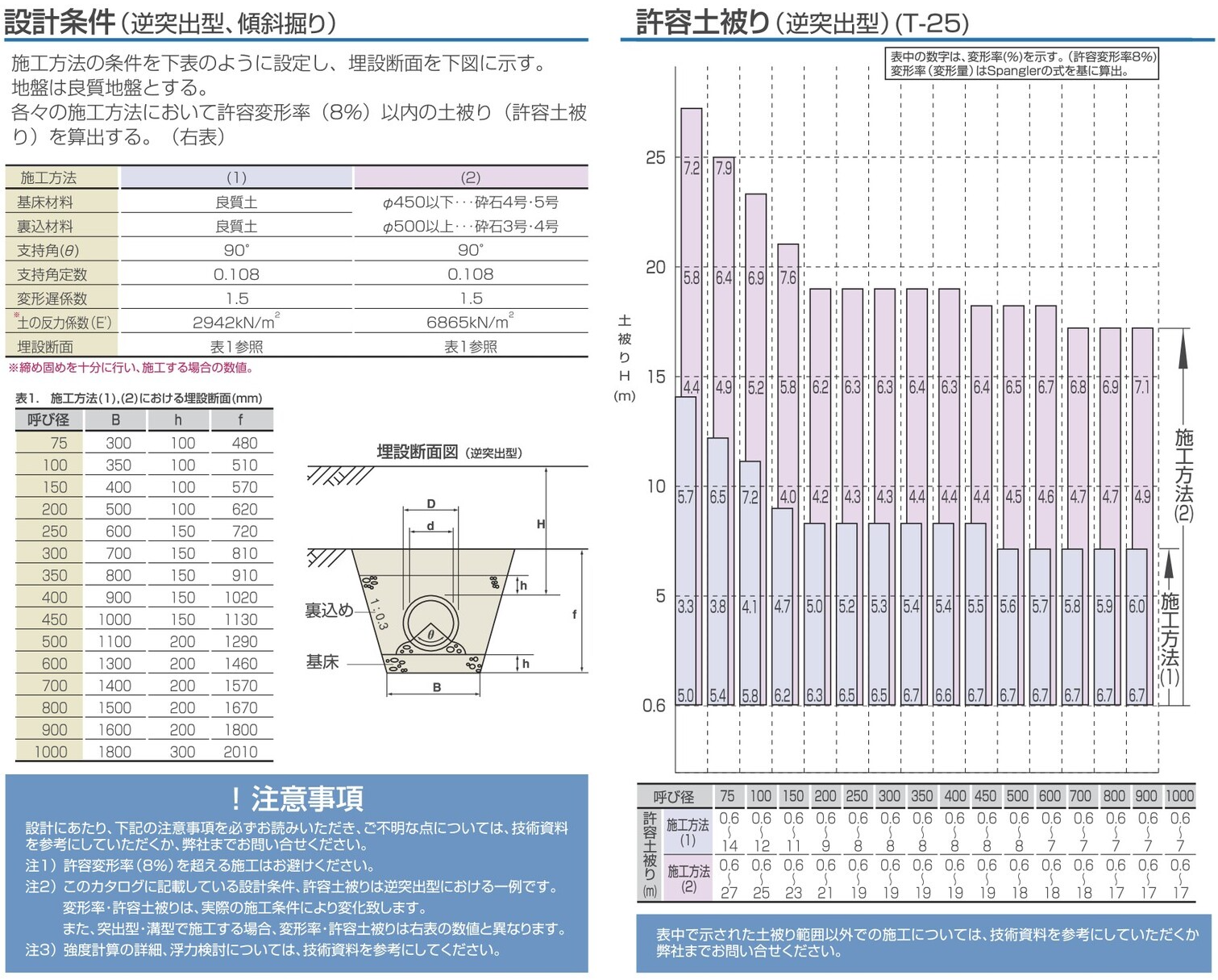 - 設計条件、許容土被り、流速と流量、耐薬品性、材料物性などはカタログ、技術資料をご参照ください。