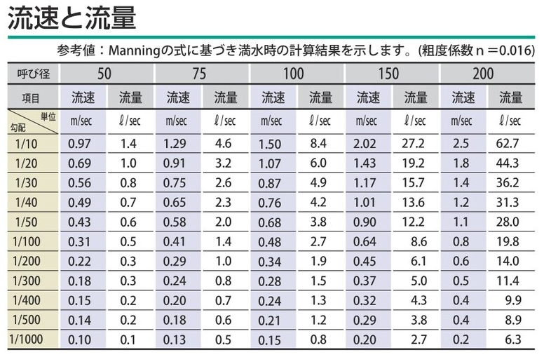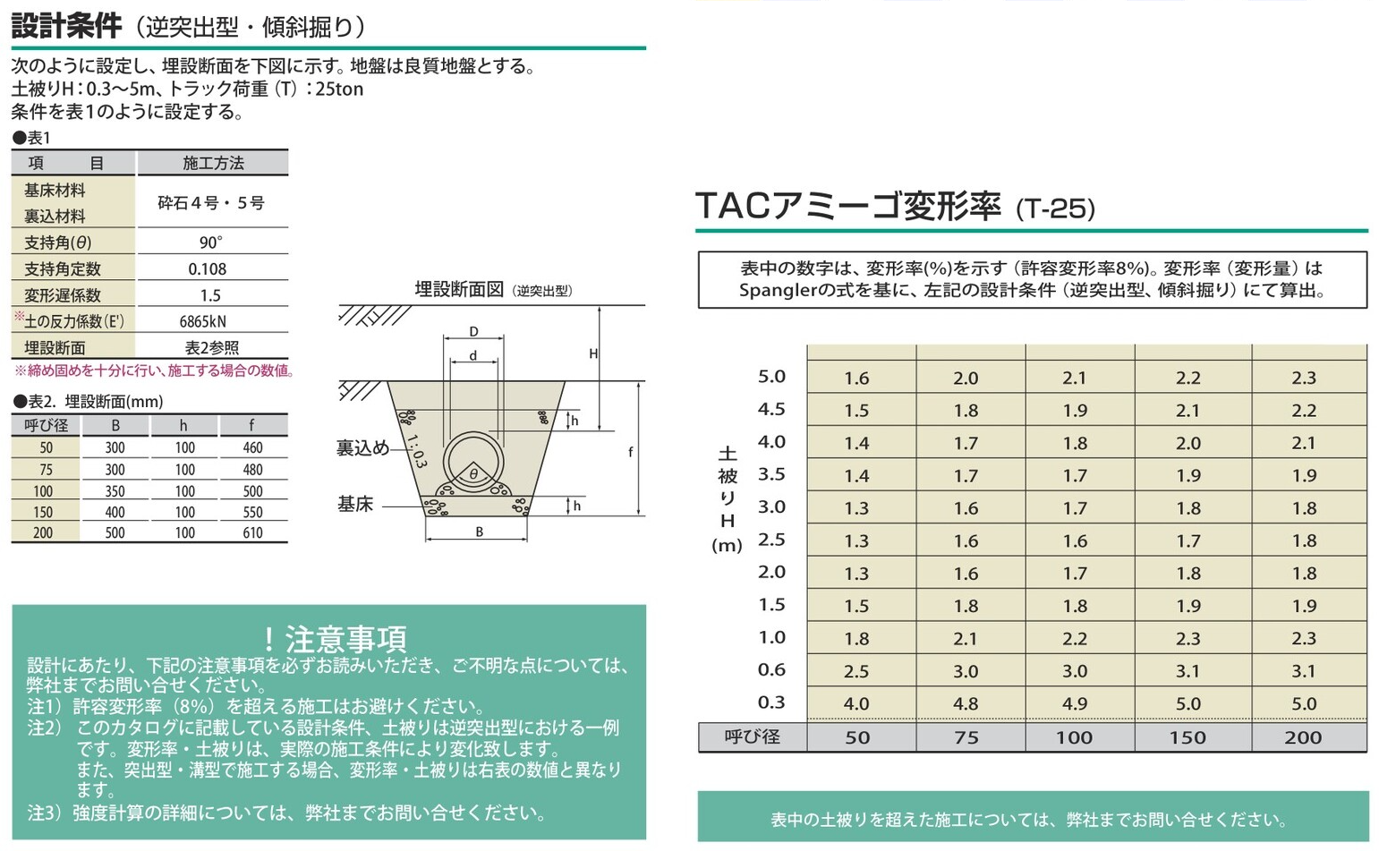 - 設計条件、許容土被り、流速と流量、耐薬品性、材料物性などはカタログ、技術資料をご参照ください。