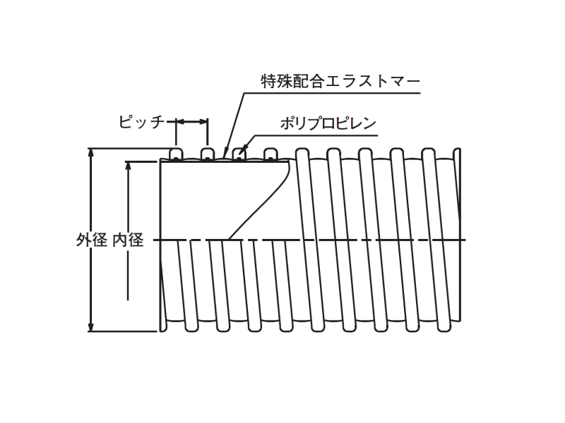 | 呼び径 mm  | 呼び径 inch  | 内径 mm  | 外径 mm  | ピッチ mm  | 参考質量 g/m  | 定尺 m  | 許容圧力 (常温) MPa  | 許容圧力 (常温) kgf/㎠  | 許容減圧力 (常温) kPa  | 許容減圧力 (常温) mmHg  | 許容曲げ 半径 mm  |