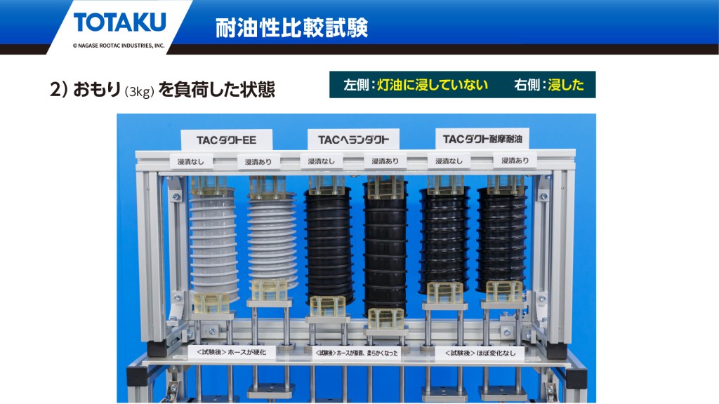 耐摩耗、耐油性、静電気防止効果の3つの要素を併せ持つ、耐油性ゴムと耐油性軟質塩ビ・硬質塩ビから成るハイブリッドホース。サイズはφ38~φ100。油分を含む金属粉や、輸送すると静電気が生じる粉粒体の搬送、ホースの摩耗防止に適しています。