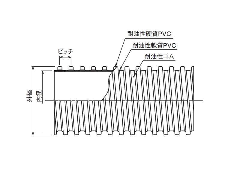 - 耐摩耗、耐油性、静電気防止効果の3つの要素を併せ持つ、耐油性ゴムと耐油性軟質塩ビ・硬質塩ビから成るハイブリッドホース。