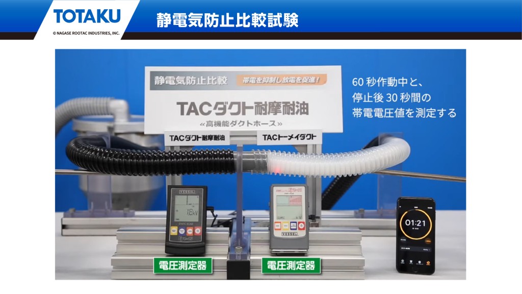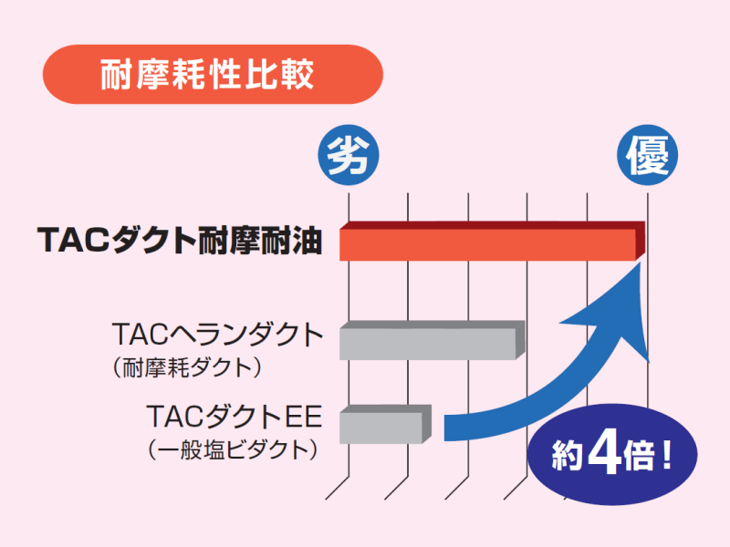 - ダクト、粉体・粒体、金属加工の廃油廃材、油分混じりのエアー送排気、油分を含む産廃、集塵、金属粉・木粉・粉粒体、ガソリンベーパー回収、オイルミストの送排気、ドレン用途(伝い流れる程度)、穀物・飼料の輸送、静電気用途