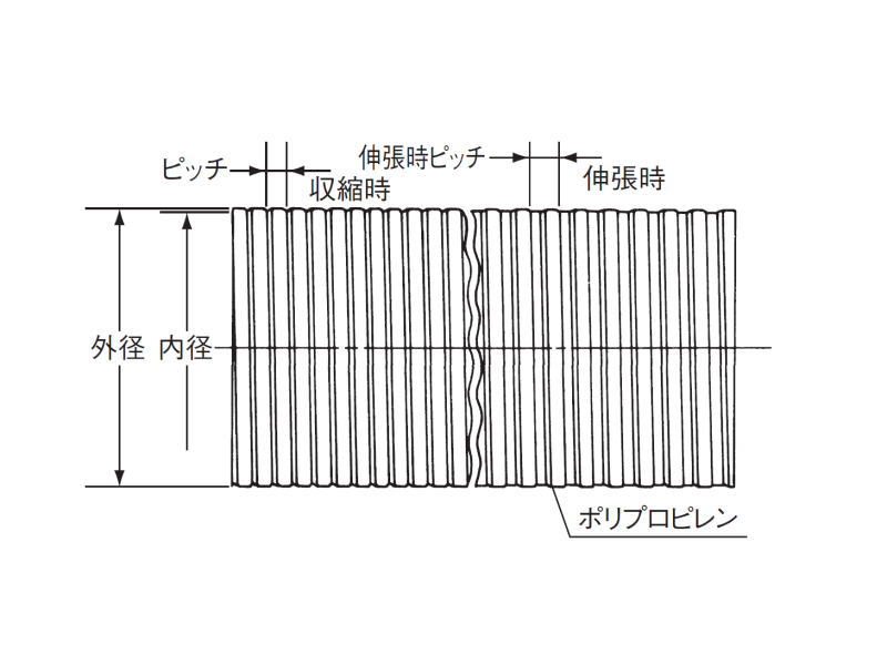 | 呼び径 mm  | 呼び径 inch  | 内径 mm  | 外径 mm  | ピッチ (収縮時) mm  | 参考質量 g/m  | 定尺 m  | 口径変化率(%) 拡大 %  | 口径変化率(%) 縮小 %  | 伸縮比 | 許容曲げ 半径 mm  | 使用可能 上限温度 ℃  |