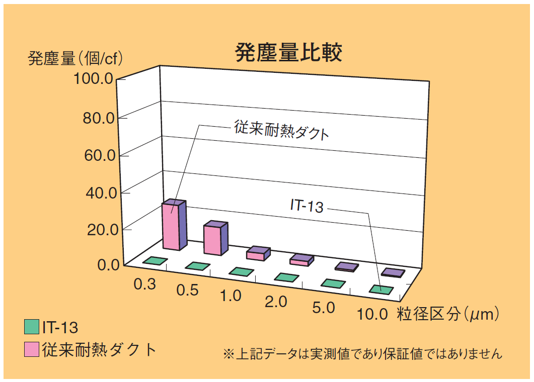 - ダクト、室内の送排気、低発塵性が必要な送排気(クリーンルームなど)、熱風発生装置、温風(130℃以下)の送排気、低発塵が必要な配管、※繰り返し曲げ可、クリーンルーム