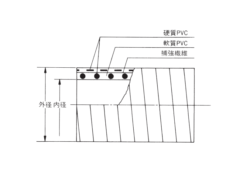 - 外面が硬質塩ビで保護されているため、外面摩耗に強く、補強糸の出にくい構造です。