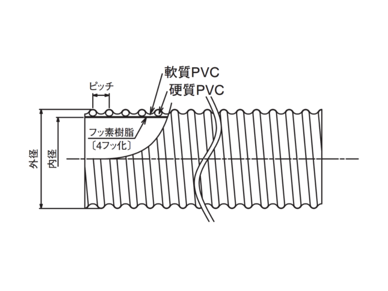 フッ素樹脂(4フッ化)をホース内面に積層した特殊構造のサクション・デリバリーホース。耐薬品・耐溶剤性、撥水性、非抽出性に優れています。