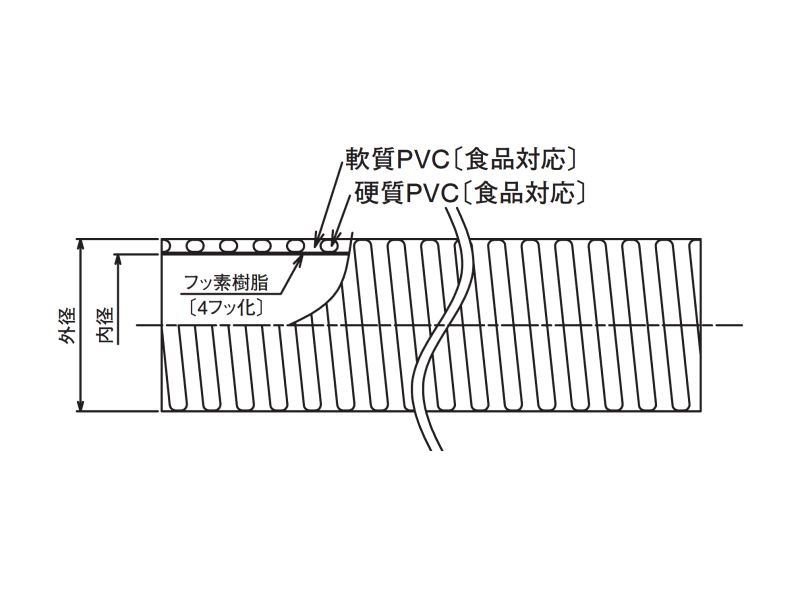 フッ素樹脂(4フッ化)をホース内面に積層した特殊構造のサクション・デリバリーホース。耐薬品・耐溶剤性、撥水性、非抽出性に優れています。