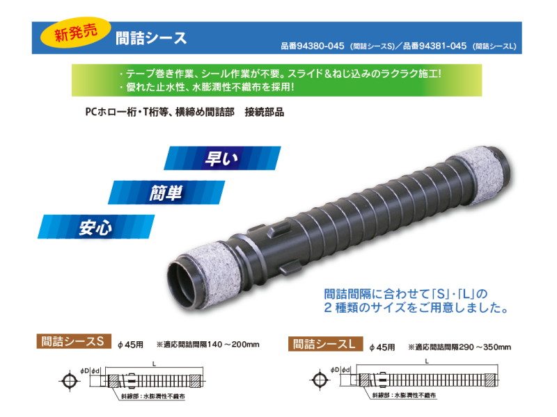 間詰部シースに止水加工を施すことで、施工を容易にした部品です。なお、写真は間詰シースSになります。