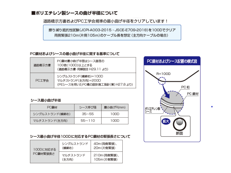 - ポリエチレン製シースは次の指針に適合します。 プレストレストコンクリート工学会/PEシースを用いたPC橋の設計施工指針(案), プレストレストコンクリート工学会/更新用プレキャストPC床版技術指針, 土木学会/コンクリート標準示方書:規準編・施工編, NEXCO/構造物施工管理要領,